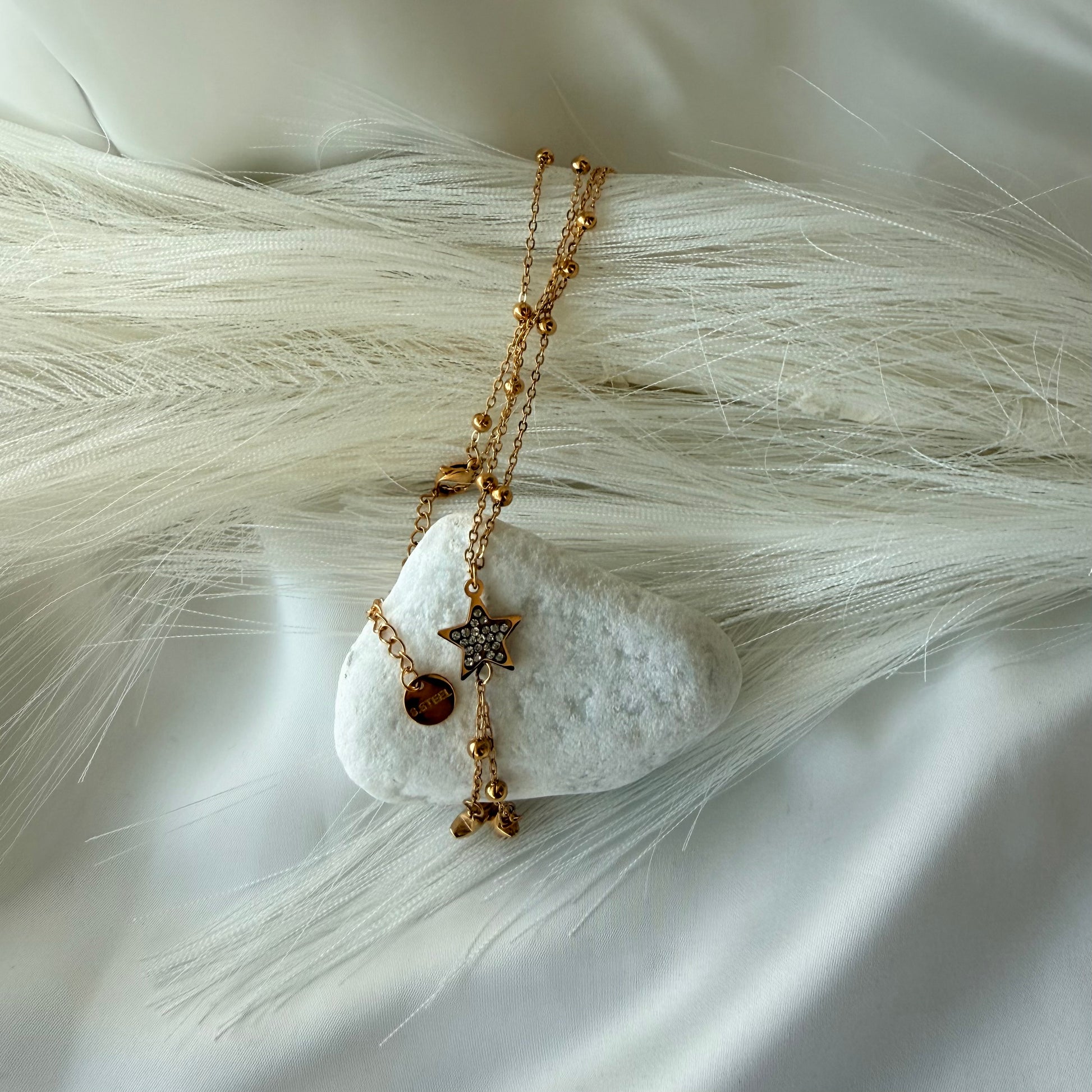 La collana “Desiderio Celeste” non è solo un gioiello, ma un simbolo: la stella centrale rappresenta la guida, l'ispirazione e la realizzazione dei propri sogni. È tempestata di brillantini luminosi per evocare il lusso discreto. Le Stelle Cadenti (pendenti): Simboleggiano la fortuna immediata e i desideri che si avverano.Realizzato in acciaio inossidabile di alta qualità, è resistente all'acqua e al tempo. É Il regalo perfetto per chi crede nei desideri.