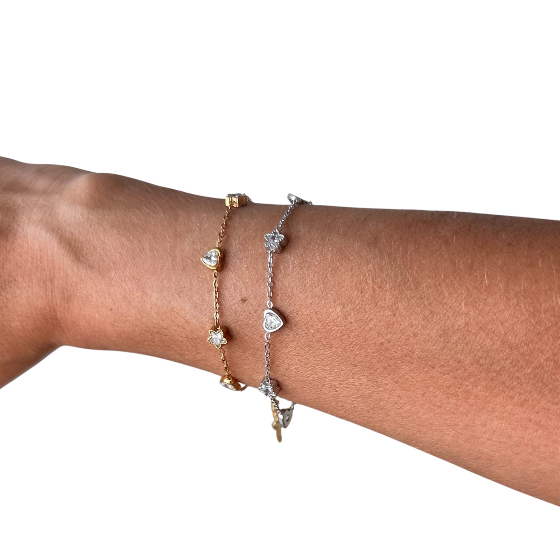 Elegante bracciale realizzato in acciaio inossidabile, noto per la sua resistenza alla corrosione e la sua lucentezza duratura. Il design presenta una catena sottile che alterna in modo armonioso charms a forma di cuore e stella, ciascuno impreziosito da un piccolo e brillante cristallo. Il cuore è un simbolo intramontabile di amore e affetto, mentre la stella rappresenta la speranza e la realizzazione dei sogni.