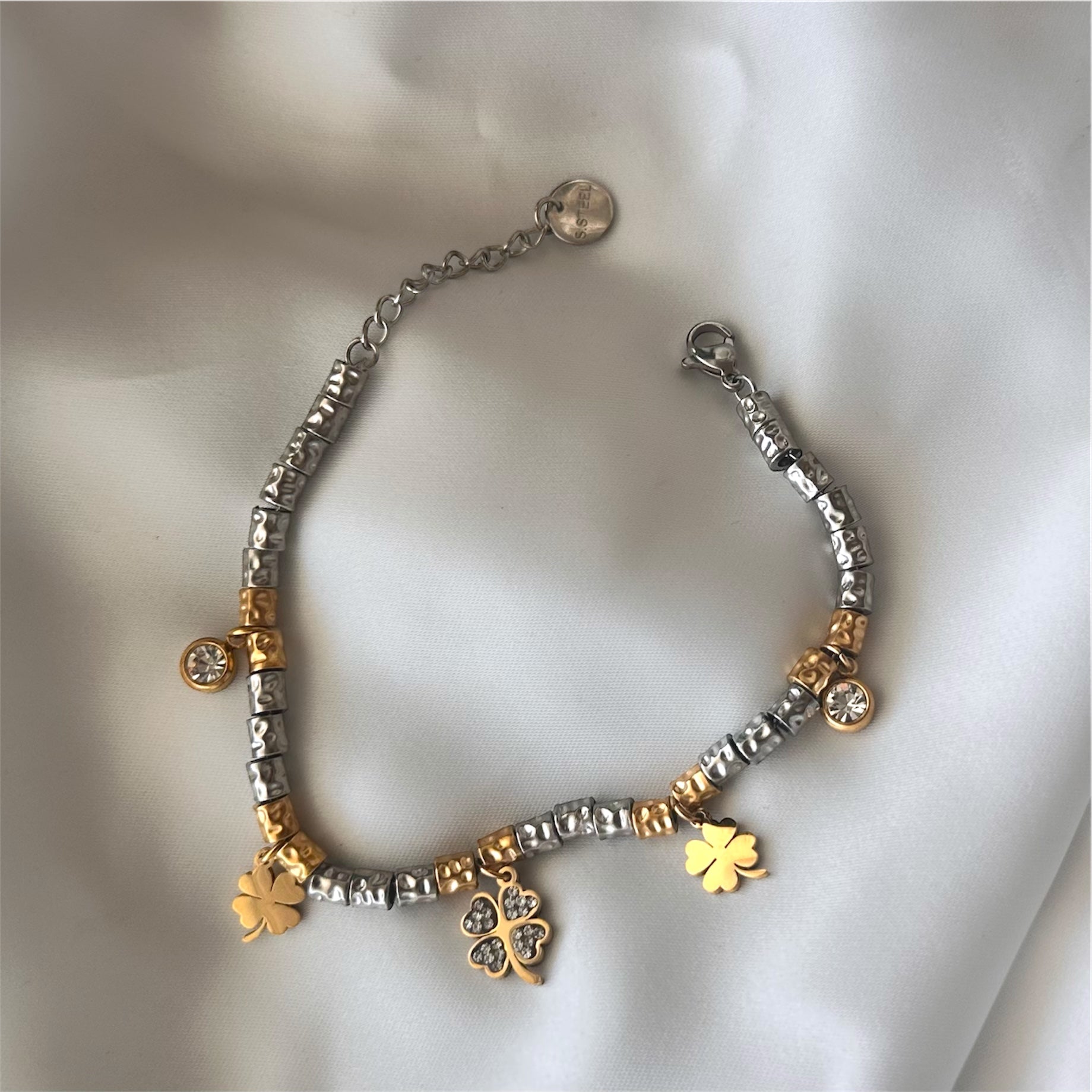 Ogni giorno è una pagina della tua vita, e il bracciale "Diletta Quadrifoglio " è fatto per celebrarla. I suoi dadi bicolore, con la loro finitura "martellata", simboleggiano le decisioni audaci che prendi ogni giorno. I punti luce rappresentano l'amore che guida le tue scelte, e il quadrifoglio celebra la fortuna che accogli quando credi in te stessa.