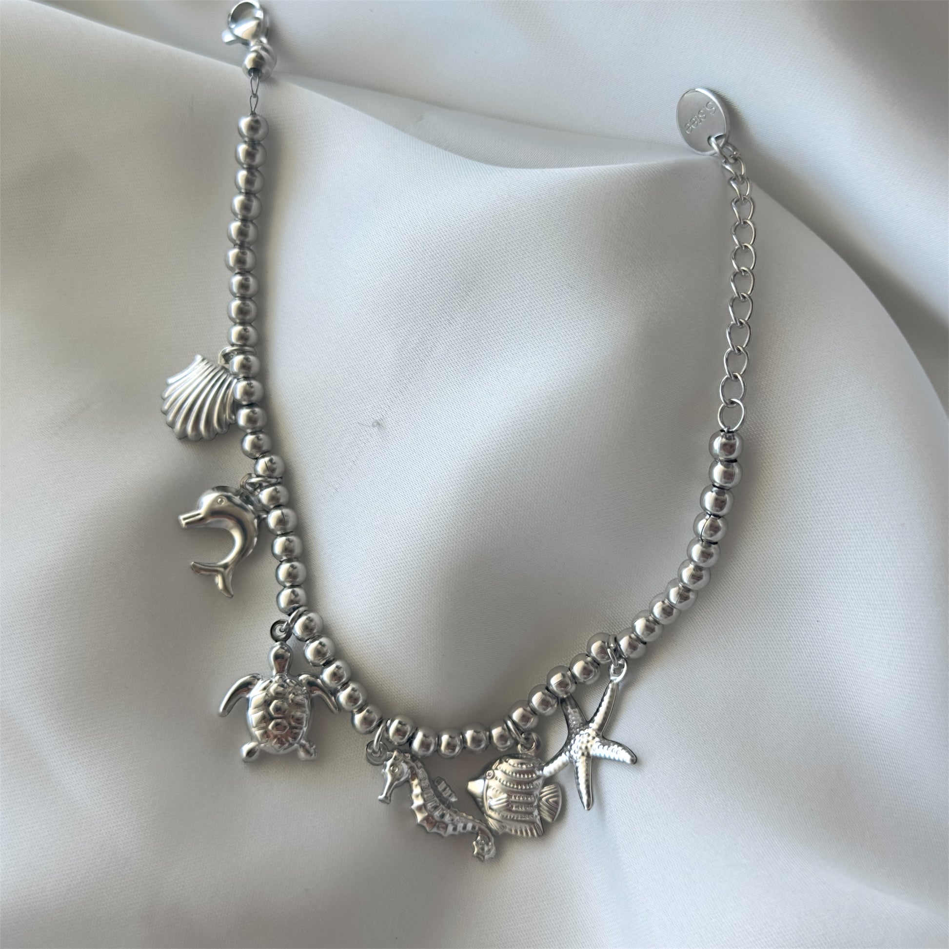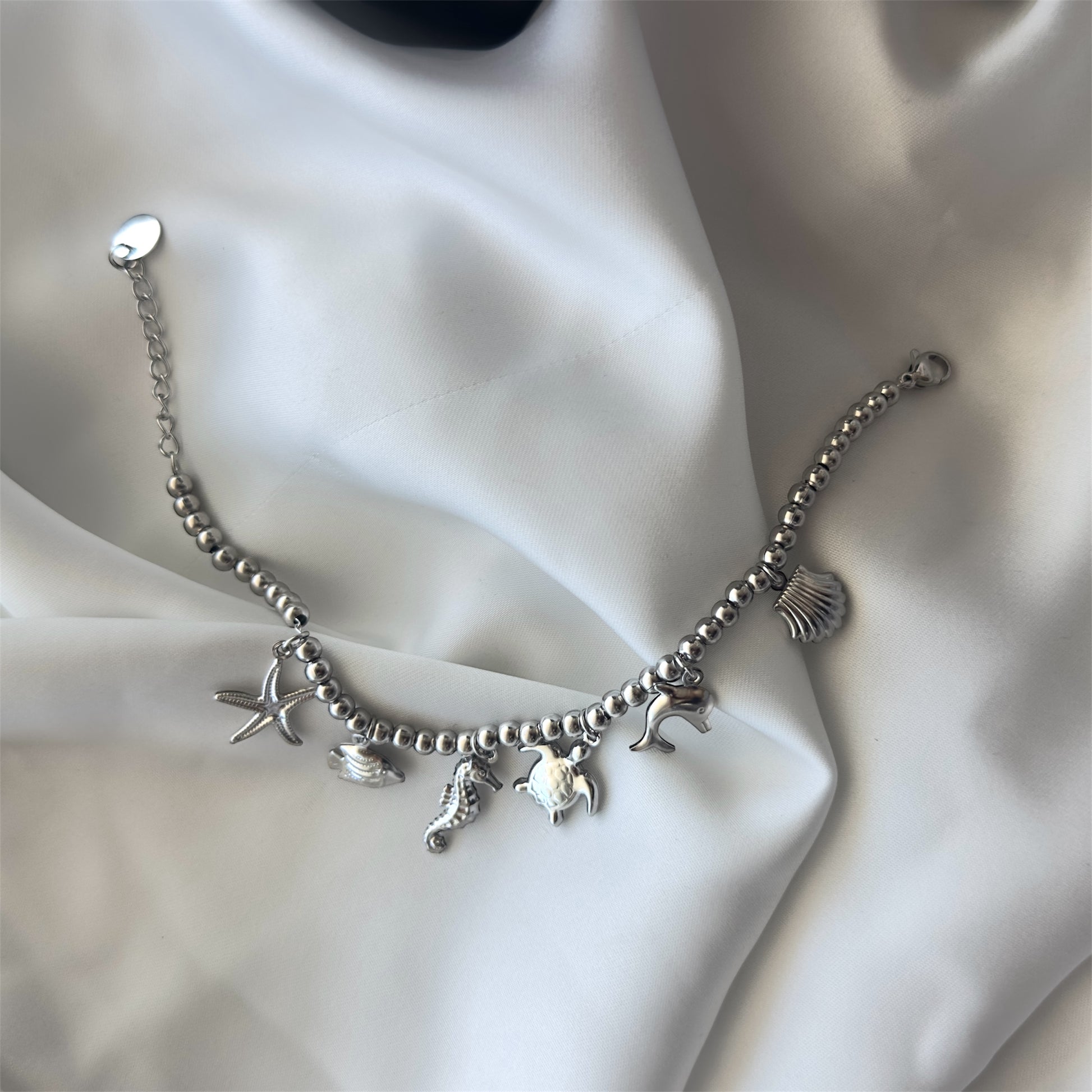 Un tuffo nello stile! bracciale in acciaio inossidabile con sfere di 6 mm e ciondoli Marini Sonaglio è l’accessorio ideale per chi ama il mare e desidera portarlo sempre con sé, con un design raffinato e materiali di alta qualità.
