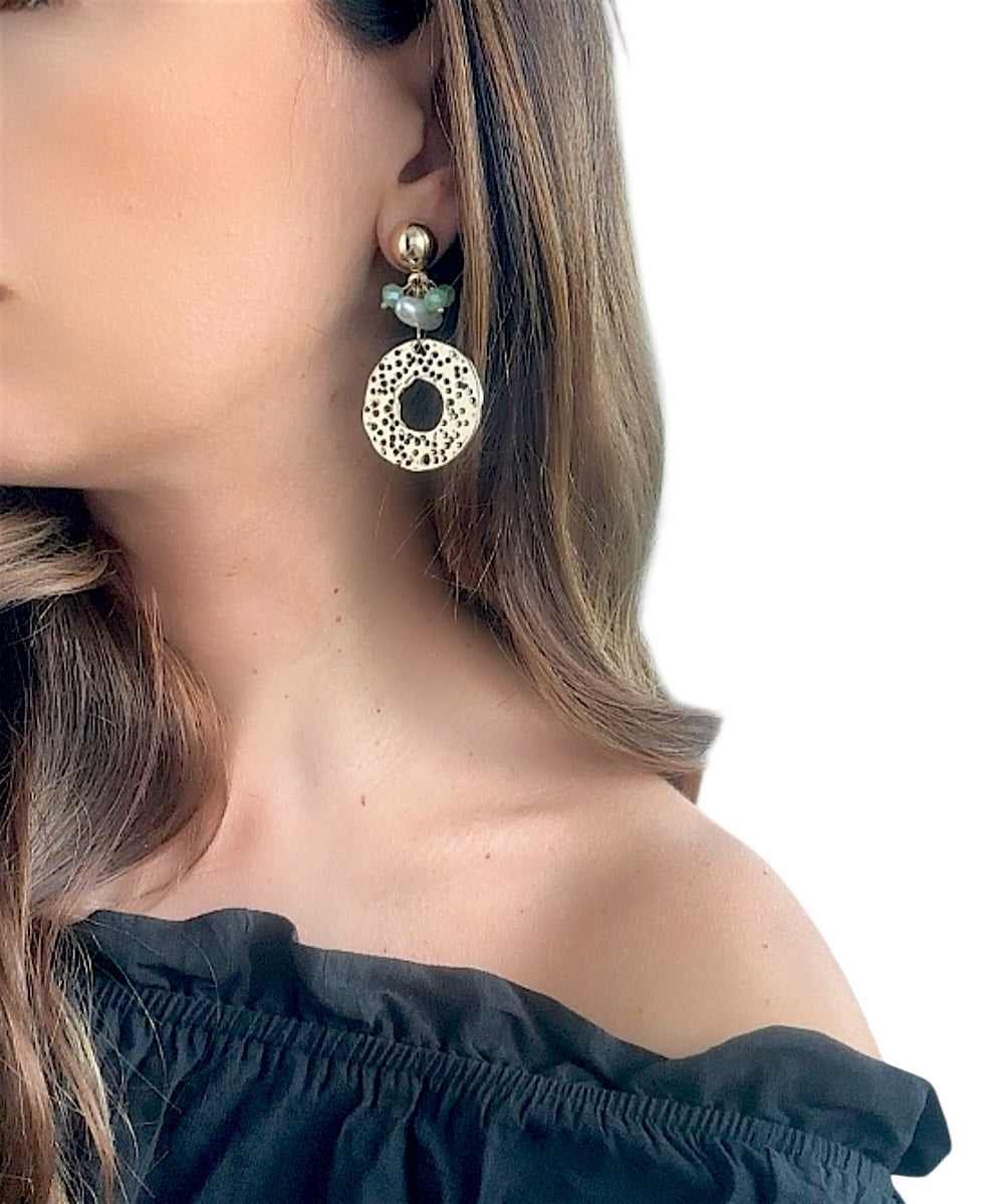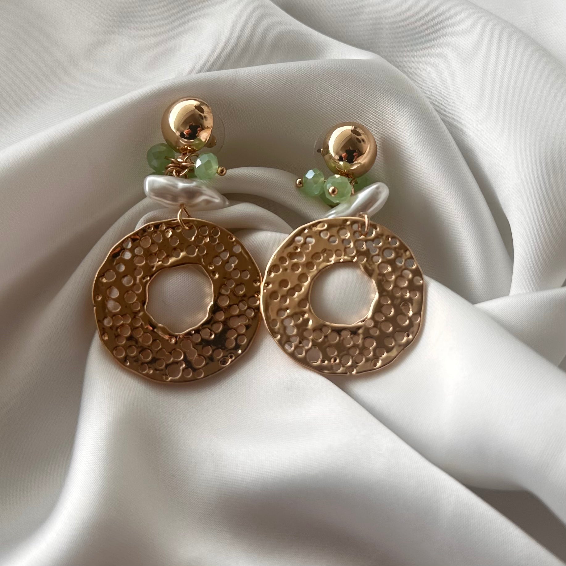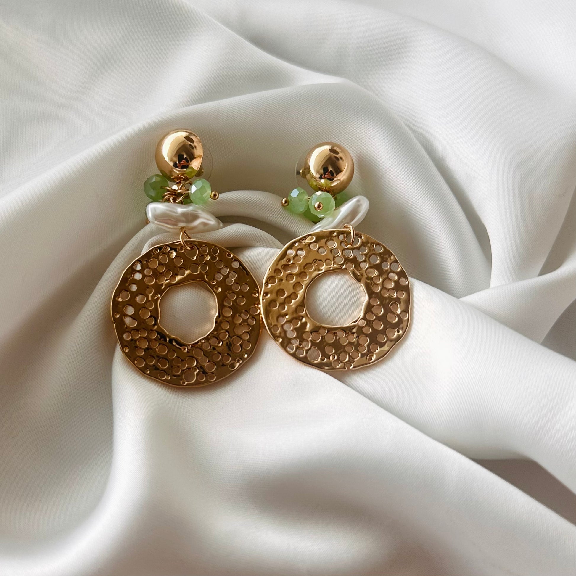 Orecchini Pendenti con Perla Bianca e Corallini Verdi – Cerchio “Golf”
